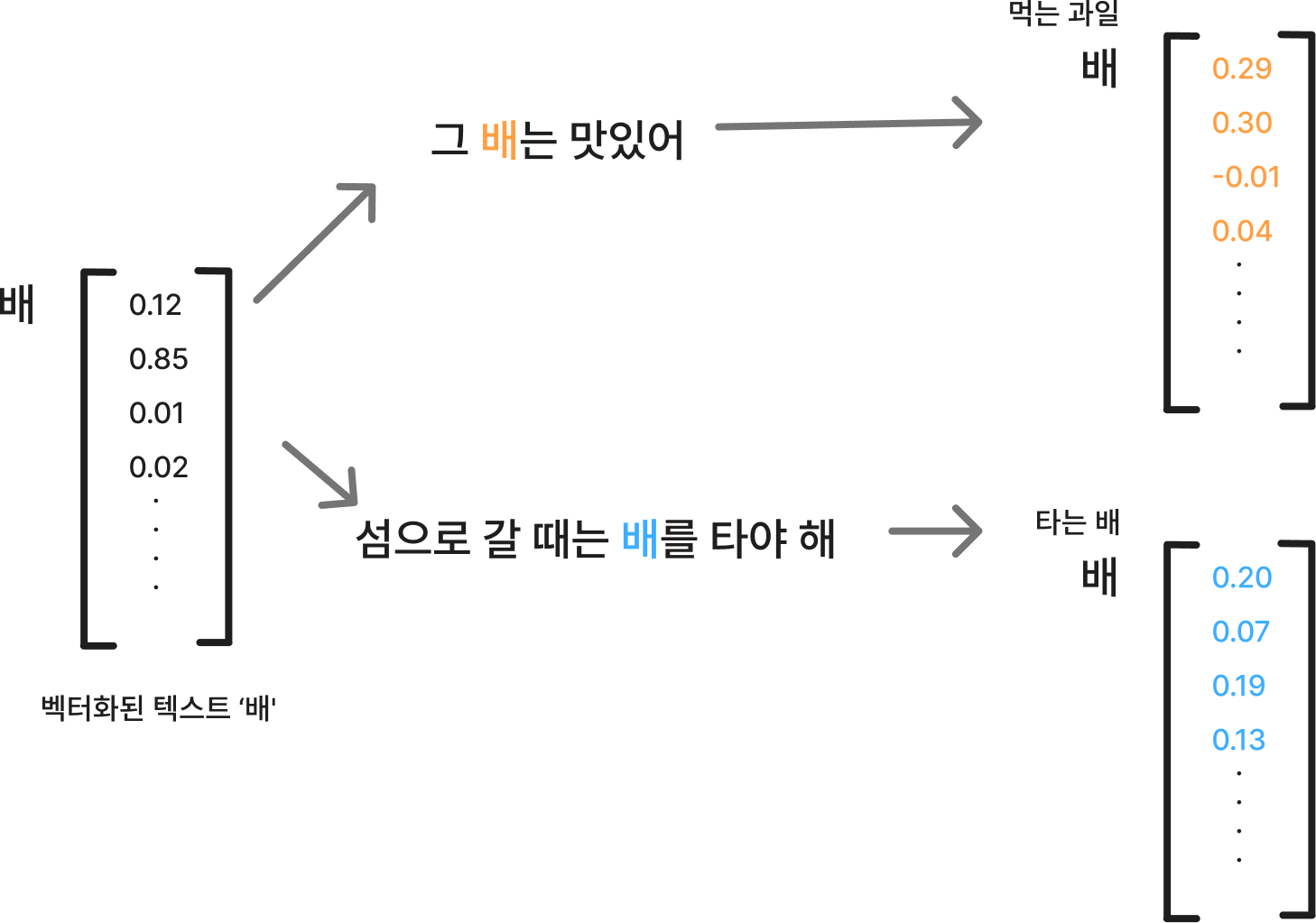 - '그 배는 맛있어' 문장에서 배는 '먹는 과일 배'라는 맥락을 가지게 되므로, '배'의 벡터는 [0.29, 0.30, -0.01, 0.04, ...] 로 바뀐다